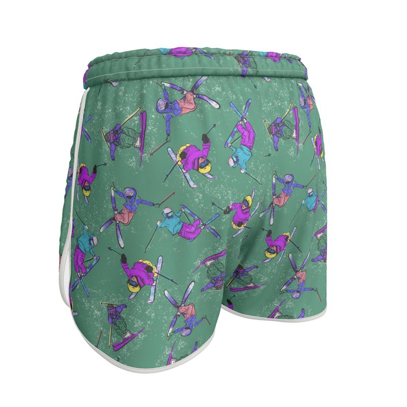 Sports shorts designed for skiers, mountain & snow sports lovers & adrenaline seekers. Designed with vibrant, abstract illustrations of real female skiers in real freestyle positions.