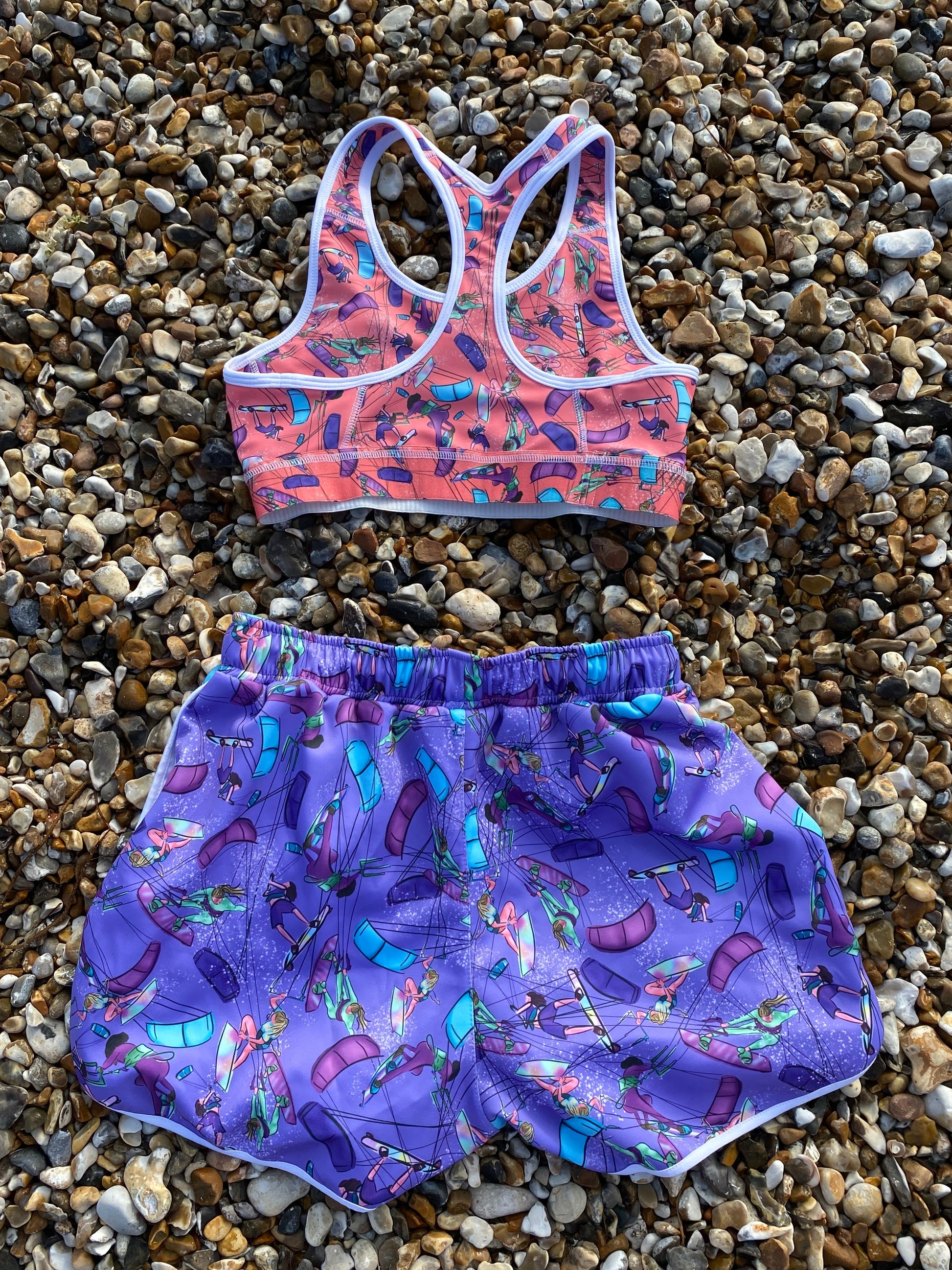 Sports shorts designed for skiers, mountain & snowsports lovers & adrenaline seekers. Designed with vibrant, abstract illustrations of real female skiers in real freestyle positions.